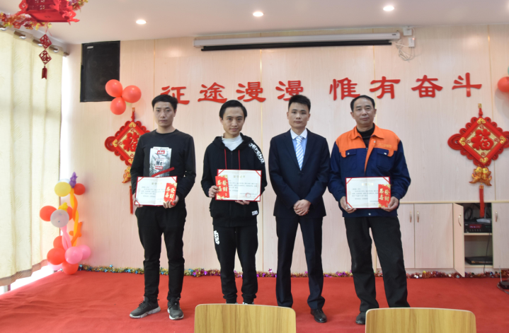 生產(chǎn)部經(jīng)理陽(yáng)專(zhuān)為周偉群、胡勇波、李加龍、唐江明頒發(fā)先進(jìn)個(gè)人獎(jiǎng)
