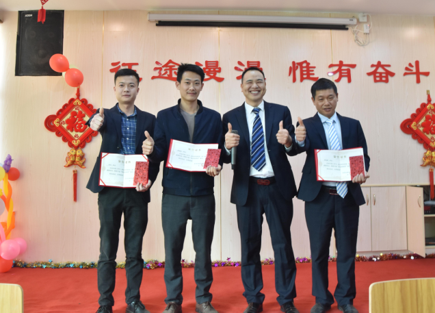 營(yíng)銷(xiāo)部經(jīng)理伍綱強(qiáng)為邱高明、周美芳、黃榮先、龔超頒發(fā)先進(jìn)個(gè)人獎(jiǎng)